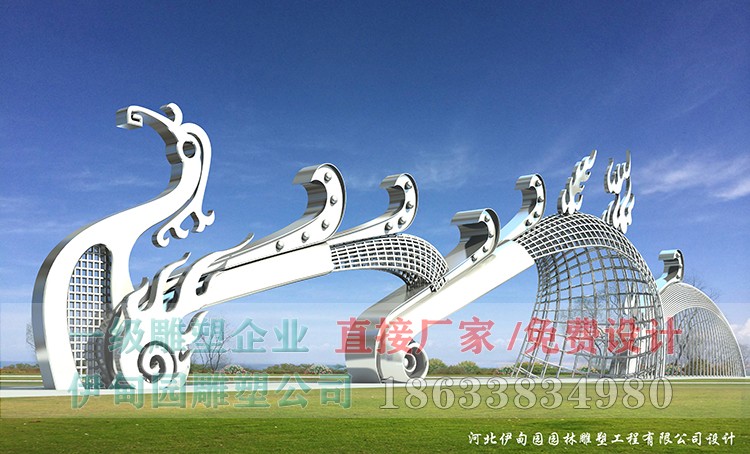 大門不銹鋼雕塑制作流程:設計圖紙→骨架放大→板材鍛造→整形修復→焊接成型→環(huán)氧底漆→氟碳面漆→分節(jié)運輸→工地安裝。