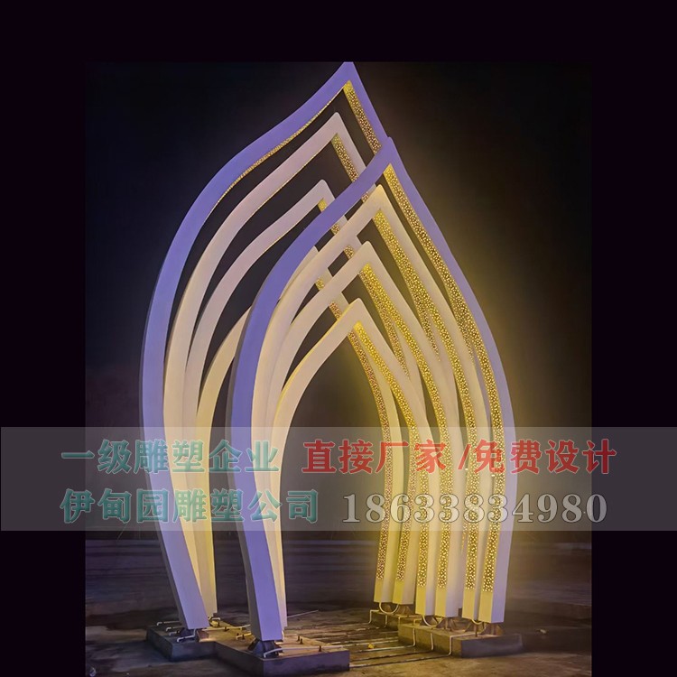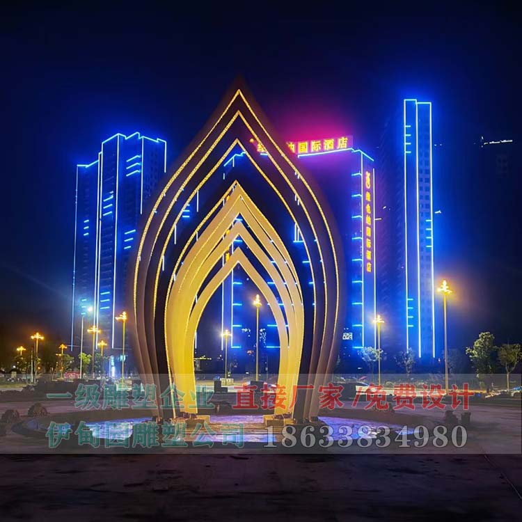 燈光雕塑采用鍛造工藝技術(shù),用15--20mm厚鋼板手工鍛造,內(nèi)部鋼結(jié)構(gòu)支撐,內(nèi)置各色燈光,整體焊接、白天自有景觀雕塑夜晚又是一奇景,帶有時(shí)尚的現(xiàn)代景觀感。
