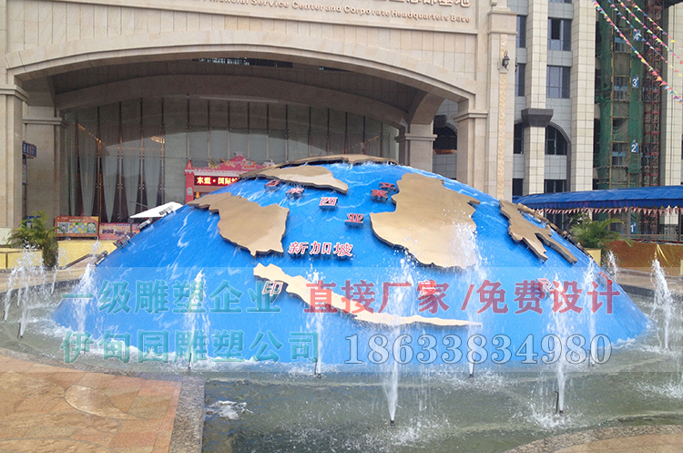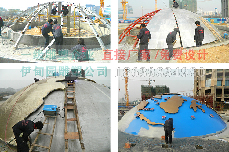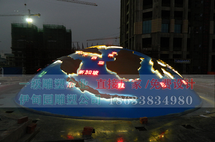 半個(gè)不銹鋼地球儀直徑11米,安裝于廣西省崇左市某單位門口。不銹鋼雕塑采用鍛造工藝技術(shù),內(nèi)部鋼結(jié)構(gòu)支撐,內(nèi)置燈光,整體焊接、白天自有景觀雕塑夜晚又是一奇景,帶有時(shí)尚的現(xiàn)代景觀感。