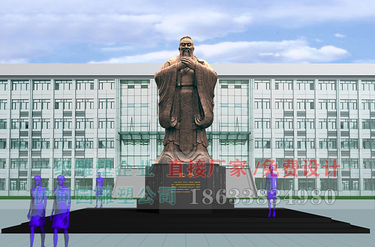 孔子雕塑,孔子作為教育始祖??鬃拥袼懿宦洞竽粗?,象征謙恭,四指并攏,代表四海之內(nèi)皆兄弟,天下大同。面部表情“溫而厲,威而不猛,恭而安”。體現(xiàn)莊嚴(yán)慈祥,和藹和諧,謙和智慧的師表形象。鑄銅材質(zhì)具有厚重感,與孔子在教育上獲得顯著的成績相呼應(yīng)。