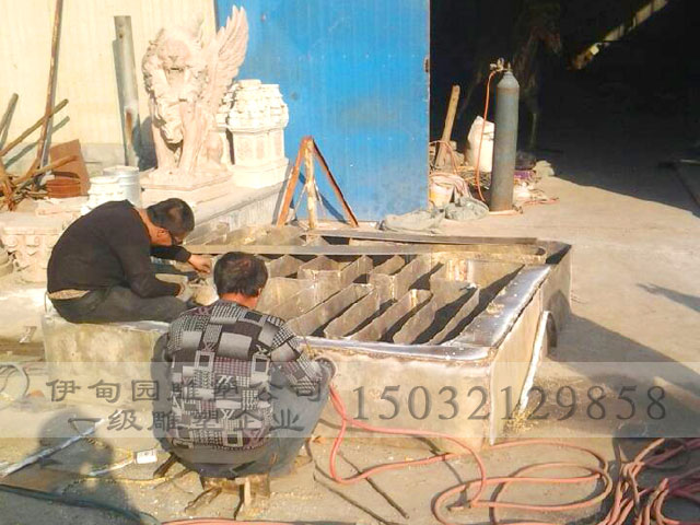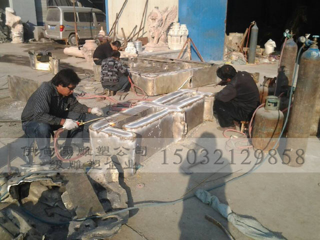 第七步:鑄造(上一道工序的中空陶殼被放入燒結(jié)爐依不同合金材料以1000℃-1150℃燒結(jié),將銅液立刻鑄入陶殼,冷卻后將外層陶殼震破,剝離出來的就是銅質(zhì)的產(chǎn)品粗胚體)。