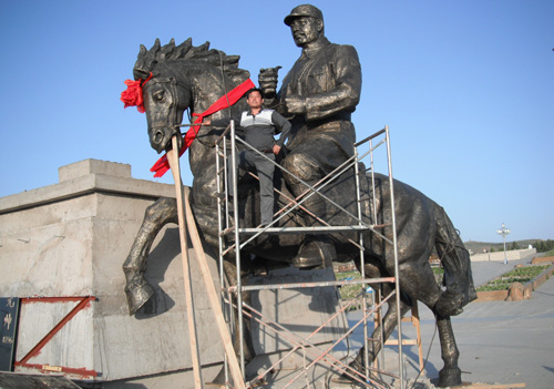人物雕塑制作完成后,根據(jù)其材料(紅銅、黃銅)的不同性質(zhì),選擇合適的方法進行表面處理。如:紅銅的清洗,首先需要用稀釋的硫酸液將紅銅表面進行刷洗,除去人物雕塑表面的油污、銹垢,然后用自來水沖洗掉具有腐蝕性的稀硫酸,這樣就可以為人物雕塑進行表面著色。先將化學藥劑倒入玻璃容器中,然后用干凈的毛刷將化學藥水涂刷在人物雕塑表面進行化學腐蝕,稍后等色彩附著在雕塑表面后,用銅刷拋刷,其后用清水洗凈擦干,上光、打蠟、保護其表面,最終完成人物雕塑制作。
