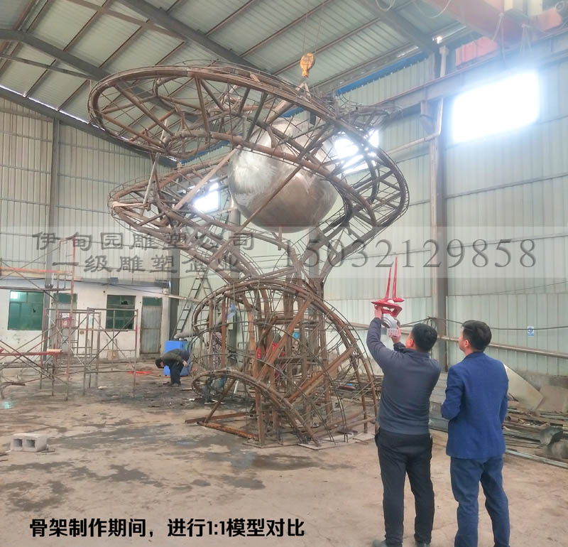 1、根據(jù)雕塑模型按比例核算到所需高度,雕塑內(nèi)骨架的規(guī)格采用槽鋼、管材和角鋼從底往上,由粗變細、由密而疏焊成方籠。