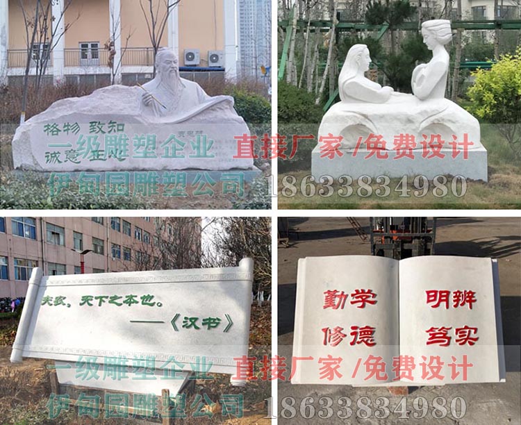 該組校園雕塑安裝于山東省濰坊市某學(xué)校,雕塑內(nèi)容包含:不銹鋼黨旗雕塑、賈思勰雕塑、書卷雕塑、漢白玉書雕塑、讀書雕塑、景觀石雕塑,共計6件。